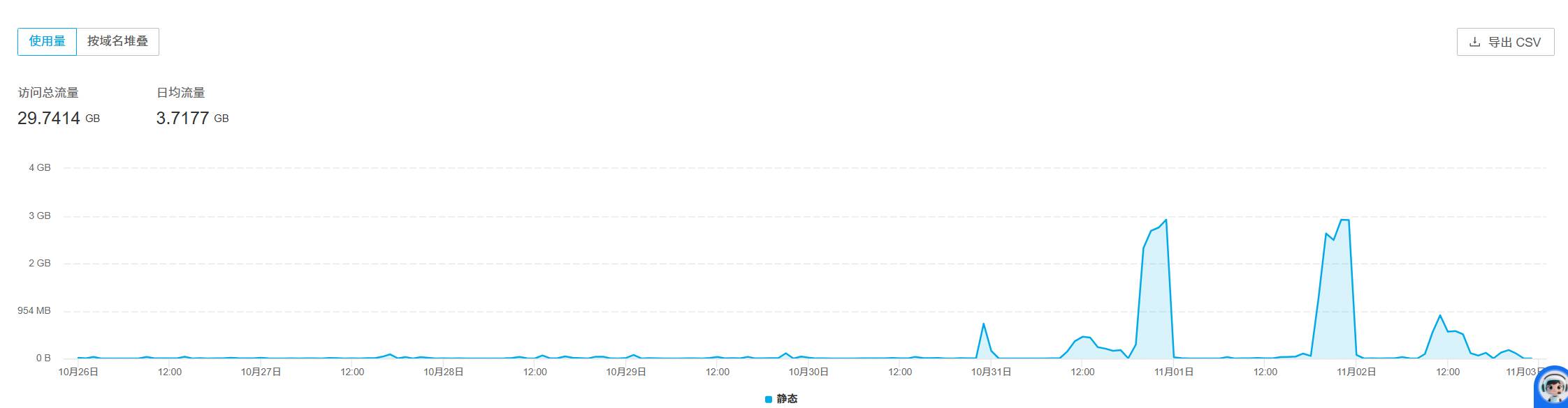 然后我登录七牛云管理平台,发现10月31号和11月1号晚上21:00-23:00短短3个小时刷了10G流量,2天用了我20G📈。
