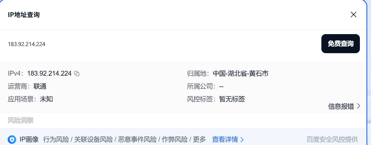 不过很少有用国内IP进行攻击的,当然攻击者不只是这个IP进行盗刷,有其他网段的IP,不过都指向湖北黄石市📍。