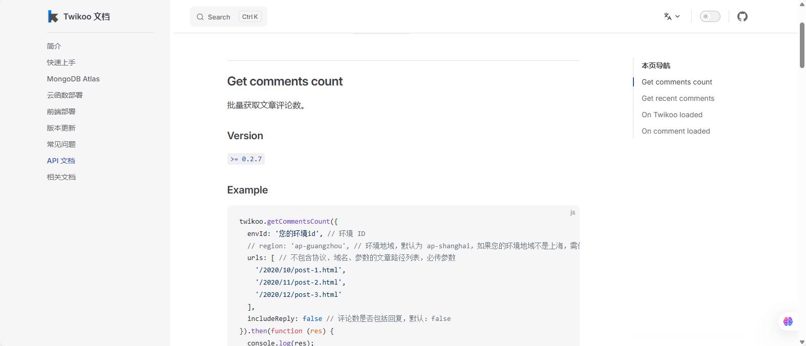 目前博客文章列表只会显示字数和阅读时间,不会显示评论数,不过博客接入了twikoo评论系统,我翻了翻官方文档,发现有提供获取评论数的API接口。如图: