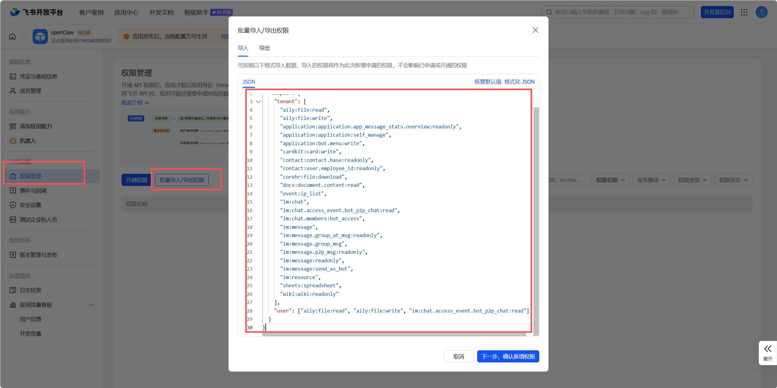 json到飞书的权限管理界面,详见下发图片。