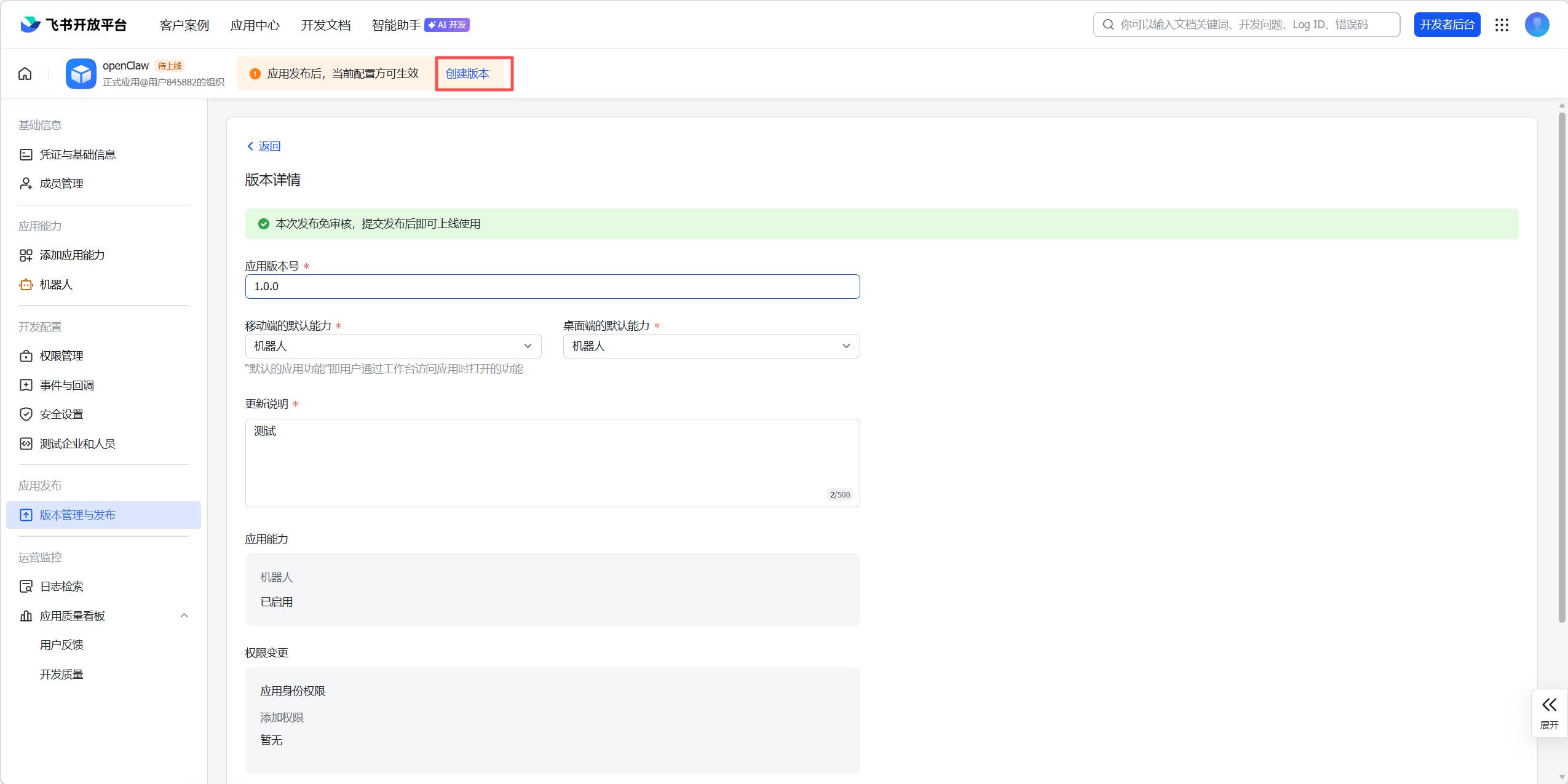 - 飞书开放平台左上角,点击创建应用版本,首次发布免审,提交弹窗点击确认发布即可。 🚀