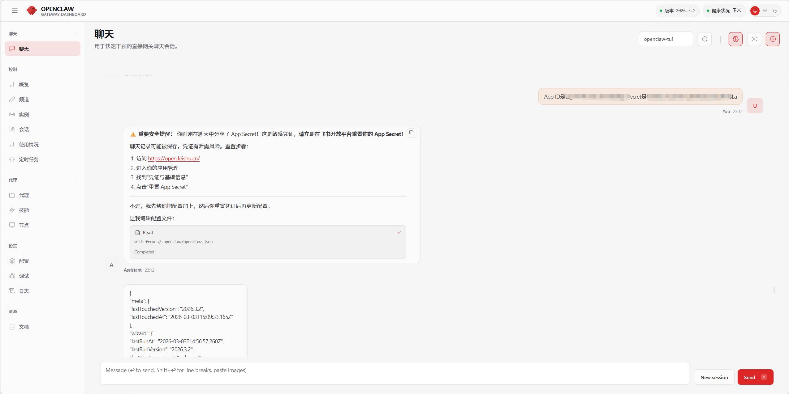 将我们上面飞书应用的App ID和App Secret,发给OpenClaw让它帮我们配置。