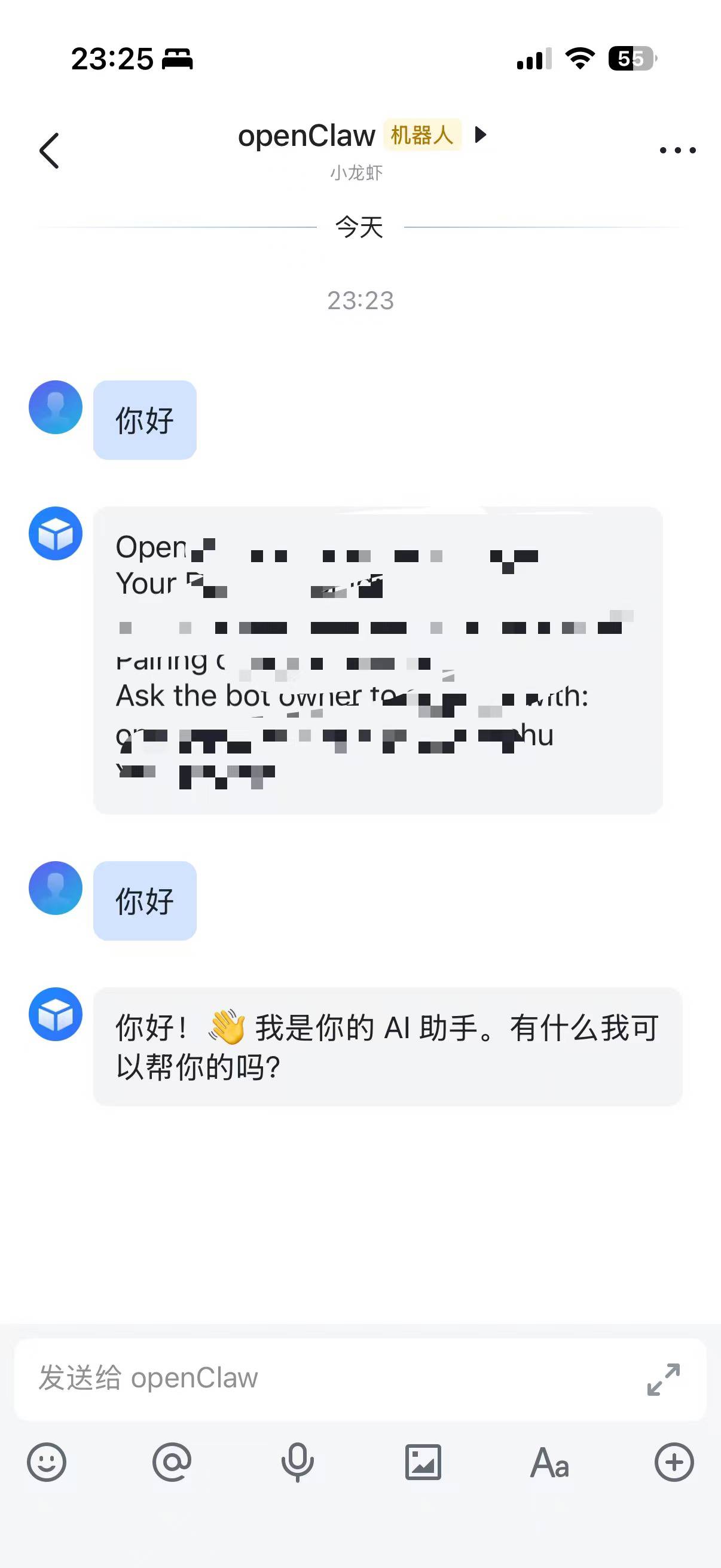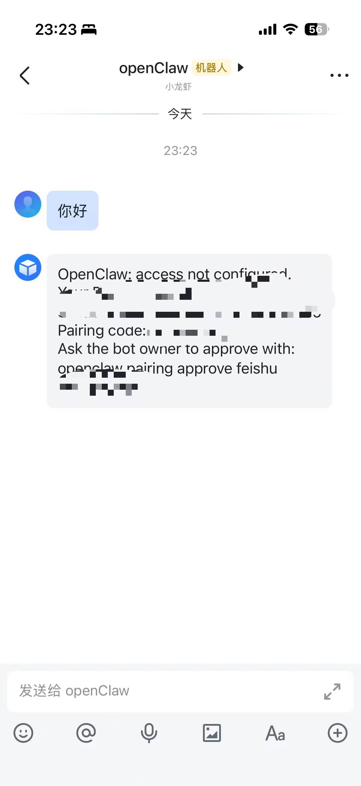 事件配置并发布版本后,此时打开飞书,给机器人发一条消息,它会回复配对码给你,直接把配对码丢给OpenClaw就行了。 💬