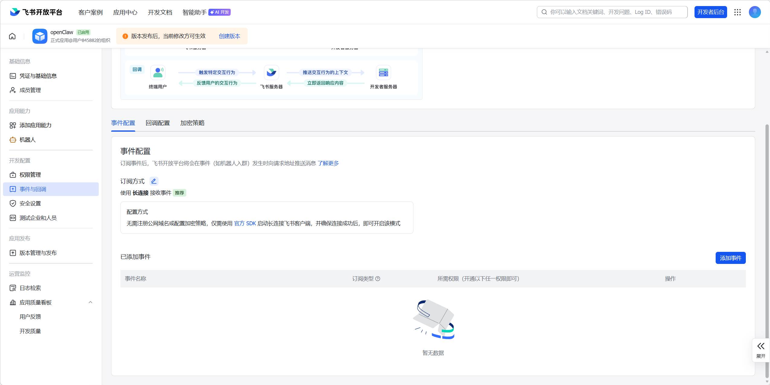 订阅方式选择长链接后,点击添加事件,添加一个接收信息的事件,然后发布版本即可。 📢