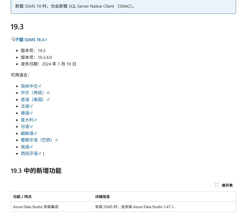这边我选择安装的是19.3版本,安装的时候发生了一件小插曲,我是直接点击的下载SSMS 19.3,安装完成后发现是英文的,然后我回到下载网页才发现下面可以选择安装的语言,我又下了遍简体中文的版本。🔄