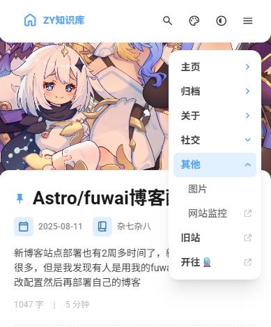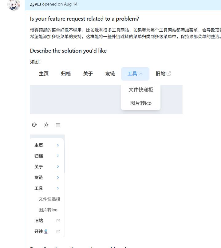 我的旧站也是基于开源项目进行魔改的,旧站的菜单非常之多,迁移到新增后舍弃了很多菜单。因为新博客默认是不支持多级菜单的,我在之前在原作者项目中提过PR,不过这种小功能,作者肯定是没时间去弄的,而且可能不符合作者的设计理念。🤔