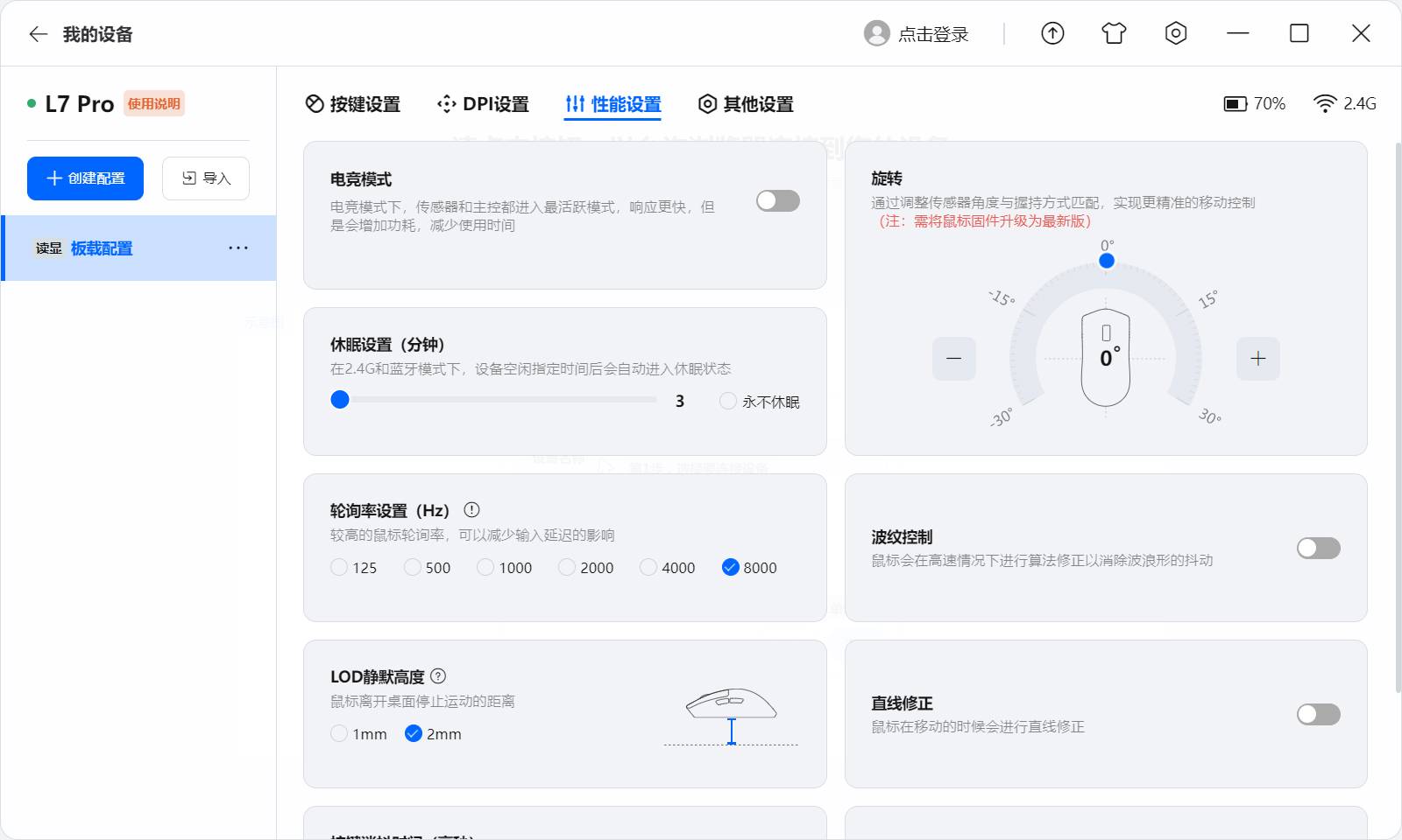 驱动页面整体还挺好看,可以设置 DPI 和开启电竞模式,以及设置鼠标轮询率,最高支持8000Hz。