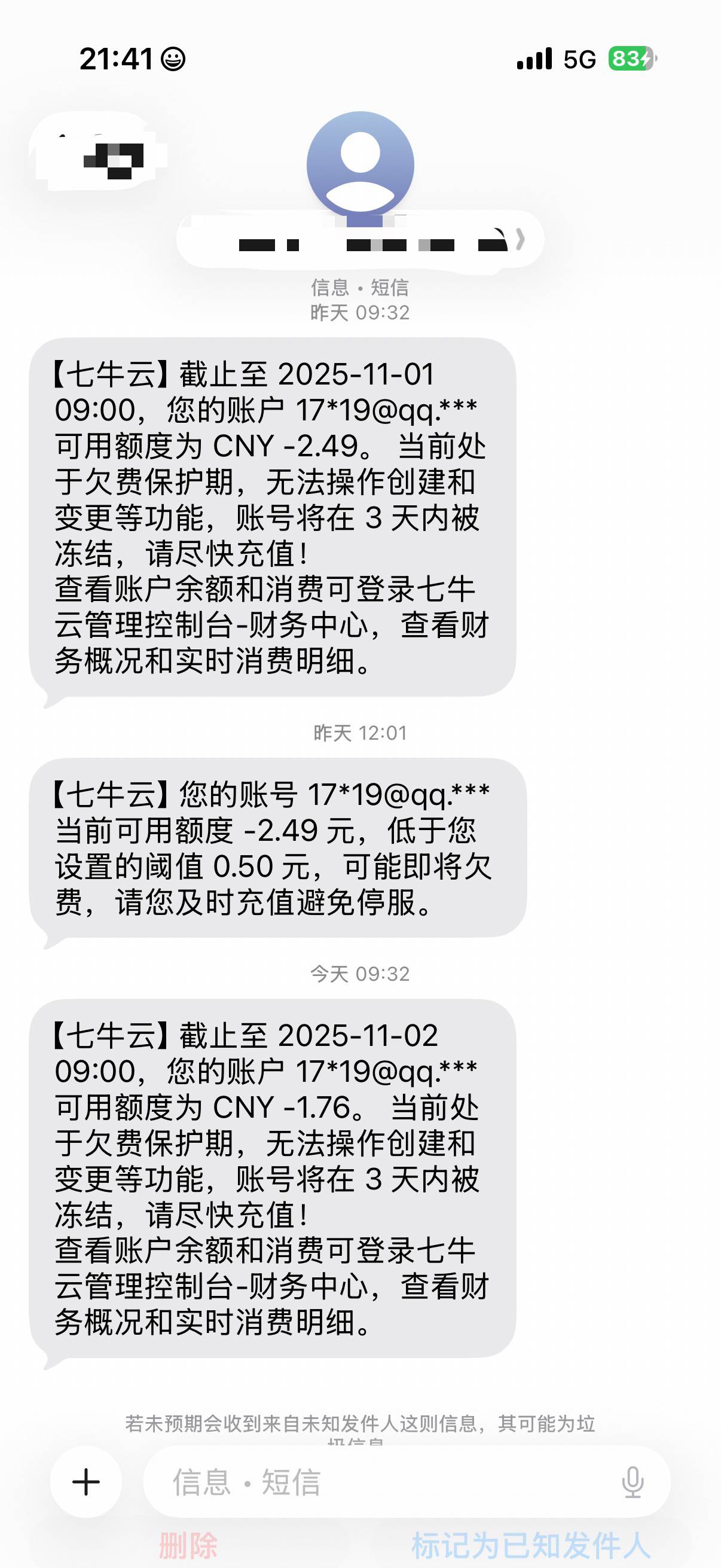 当我打开手机,查看短信的时候,发现竟然是七牛云CDN欠费通知,当时第一反应是比较震惊的😳,因为我平时一个月CDN费用才2元不到,平时网站访问量不高,而且我只是部分静态文件放在七牛云上。