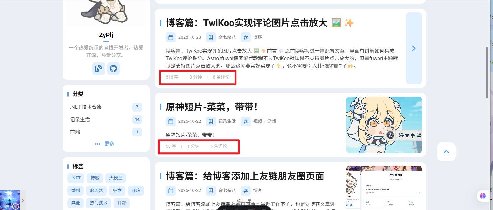 对于文章添加评论数显示,主要代码逻辑在twikoo-loader.js中完成,然后只需在母版页中导入并使用即可。