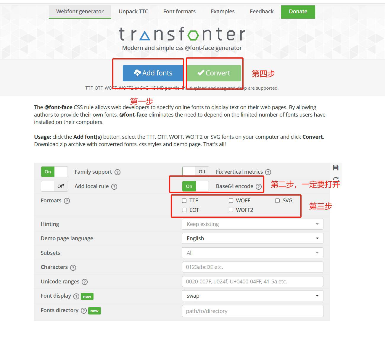 注意事项:ttf字体文件勾选TTF,woff2字体文件勾选WOFF2