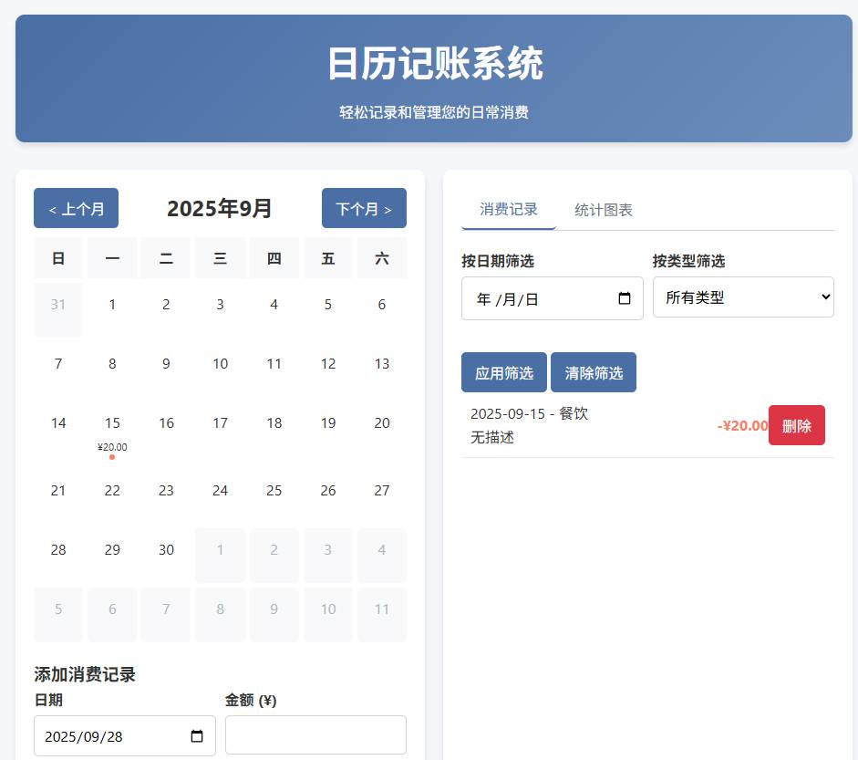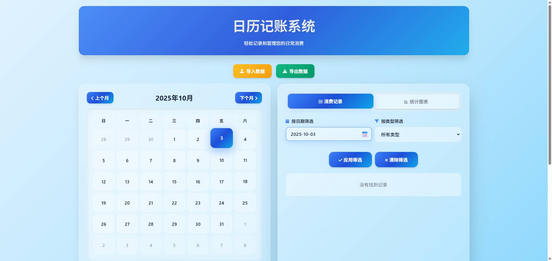 日历记账系统是一个基于 HTML + CSS + JavaScript 的本地记账网页应用🌐,内置现代化 UI、日历视图、筛选与统计功能,数据默认存储在浏览器 IndexedDB,支持一键导入/导出 JSON。