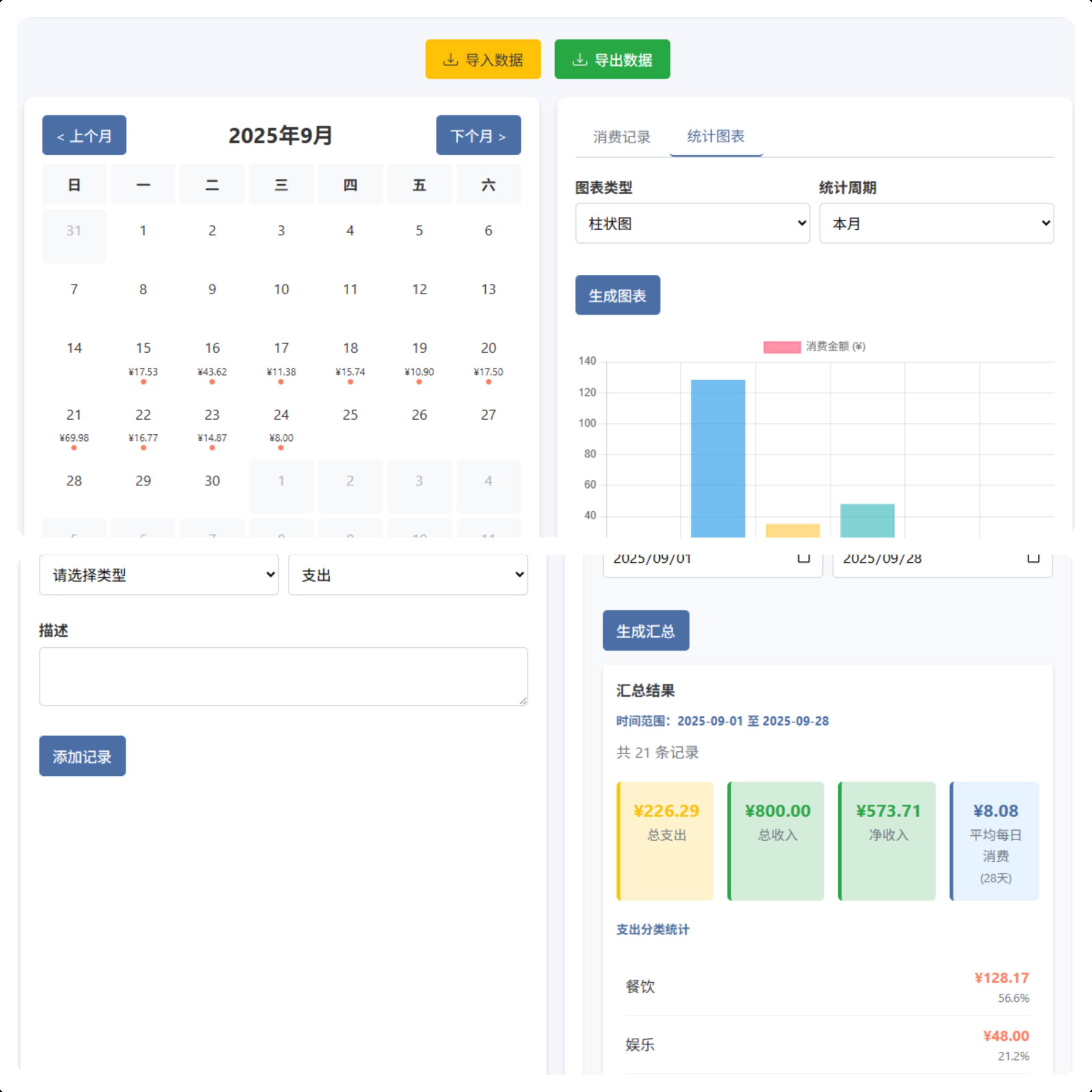 UI主题色在:rootCSS 变量中统一管理,可按需调整 - ➕ 如需扩展消费类型或字段,可在“添加记录”选择与渲染逻辑中同步调整