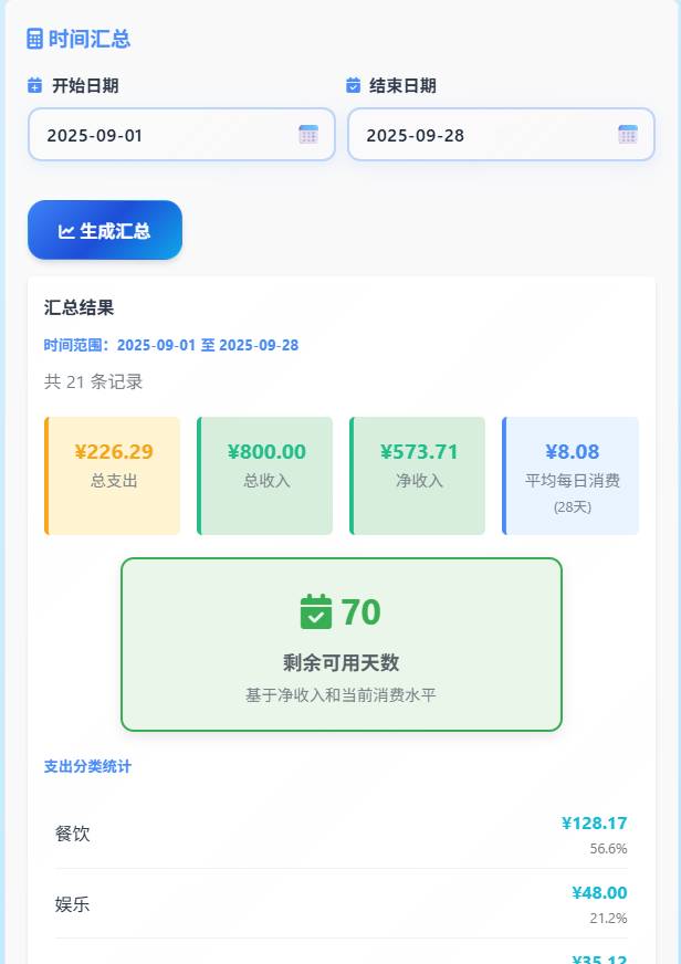 Chart.js) - ⏱️ 时间汇总:任意日期范围的收入/支出/净收入、平均每日消费与“剩余可用天数”估算