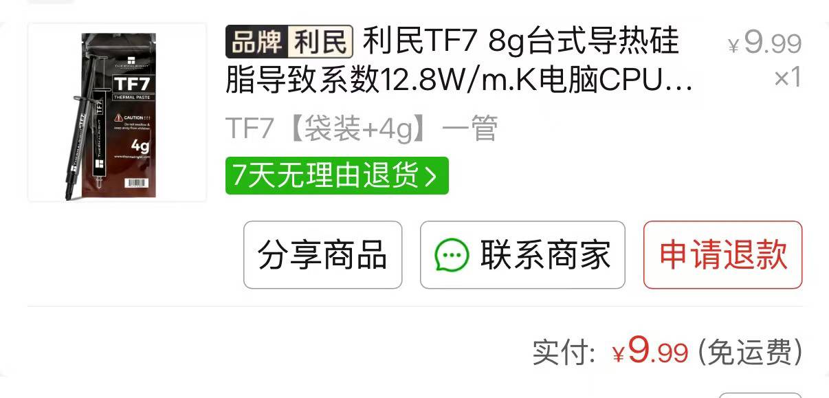 我这里用的硅脂是利民的TF7,还挺便宜的,某多上面9.9¥能买到4g。