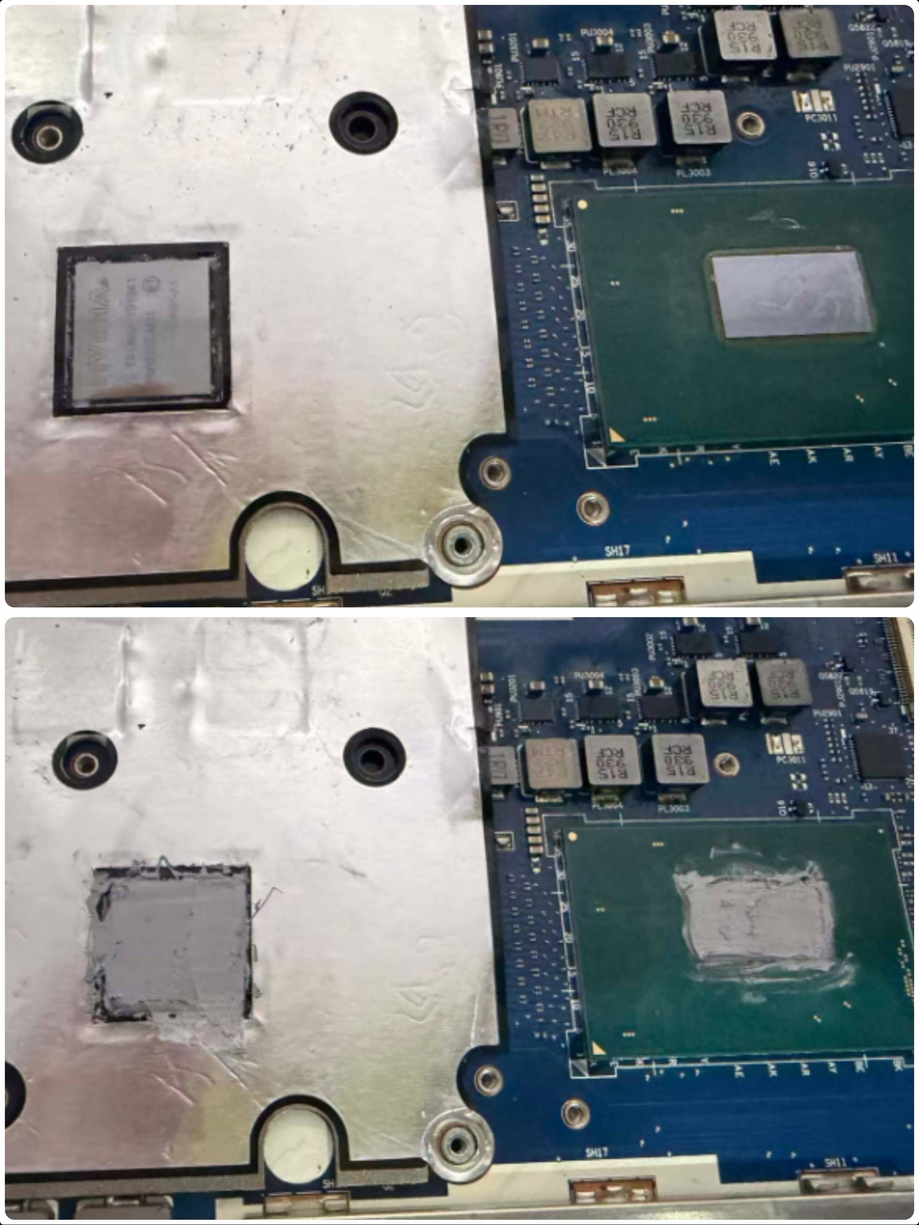 可以看到我的散热铜管和电池已经拆下来,这里是因为电池的那个接口太难拔了,拆下来好拔一点,不一定非得拆电池,但是电池的主板接口一定要拔,防止静电。