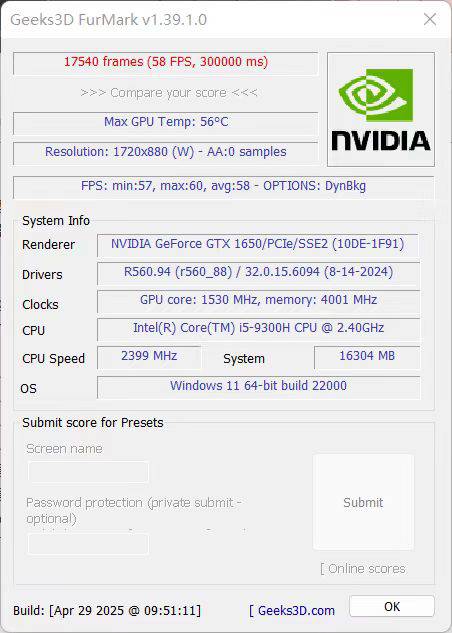 可以看到烤鸡5分钟, cpu 最大测试温度56°C,还是挺稳的。