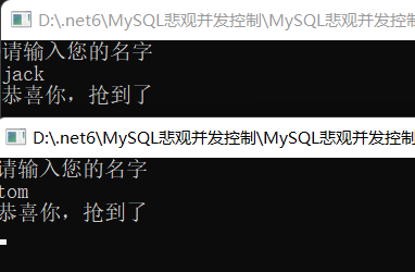 Console.WriteLine("请输入您的名字"); string name = Console.ReadLine(); using (MyDbContext db = new MyDbContext()) { var h = db.Houses.Single(h => h.Id == 1); if (!string.IsNullOrEmpty(h.Owner)) { if (h.Owner == name) { Console.WriteLine("房子已经被你抢到了"); } else { Console.WriteLine($"房子已经被【{h.Owner}】占了"); } Console.ReadKey(); return; } h.Owner = name; Thread.Sleep(5000); try { db.SaveChanges(); } catch (DbUpdateConcurrencyException ex) { Console.WriteLine("并发访问冲突"); var entry1 = ex.Entries.First(); string newValue = entry1.GetDatabaseValues().GetValue<string>("Owner"); Console.WriteLine($"被{newValue}抢先了"); } Console.ReadLine(); }